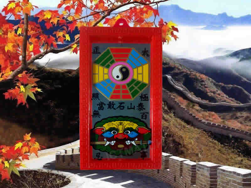 Pakua Yantra / lion with sword in mouth mirror. Mirror in rectangle shape  Size 3×6 inches. Yantras and amulets according to Chinese beliefs. Used to correct location of houses, shops or companies that are in poor locations. For example, near three-way intersection, cemetery,abandoned house, shrine,electric pole, a church, a hospital, etc. Which causes people to continue living with various obstacles in that place. When Pakua Yantra / lion with sword in mouth mirror is placed on it, according to belief, it will cause the opposite effect and good things will come.