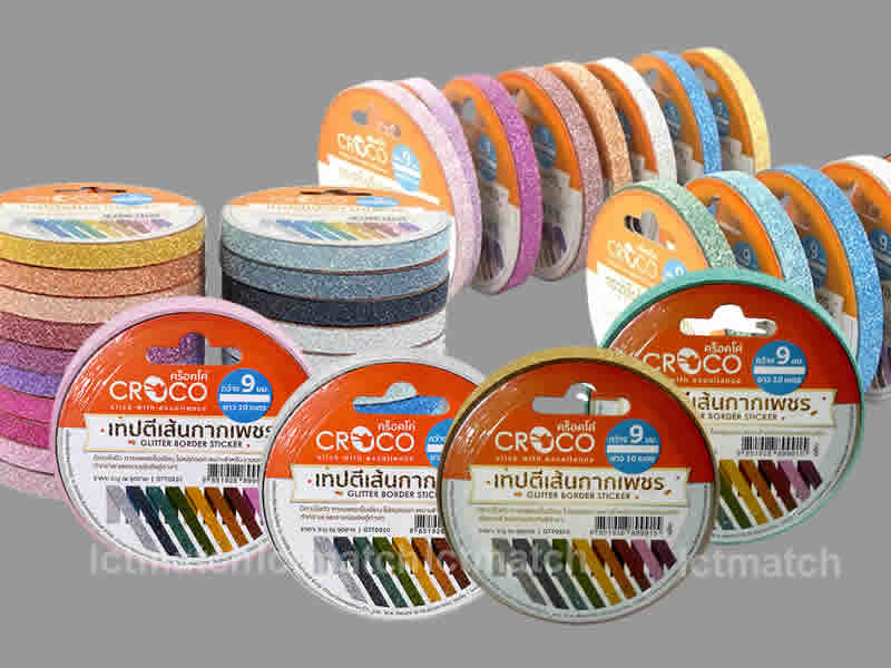 Glitter Line Tape,Brand “Croco” Width 9 mm, Length 10 m  Color:  has 4color gold,silver,light green and light pink. Sparkling shimmer with glitter that does not come off on your hands. High-quality glitter with fine sparkling particles that beautifully reflect light from every angle. No glitter shedding: Keep your hands clean and your workspace spotless! With advanced glitter embedding technology, the glitter is firmly sealed into the tape surface. Extra value length: Up to 10 meters per roll! Long-lasting and suitable for every project. Strong adhesive, firm sticking power: Adheres well to smooth surfaces such as foam board, paper, glass, plastic, and wood. Easy to use: Just peel and stick instantly. The 9 mm width is the perfect size for border decoration or creating stylish patterns.